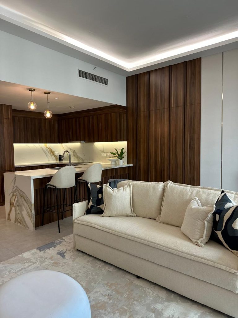 This project reflects a modern and warm living space where clean design meets everyday comfort. The open kitchen and living area are connected smoothly, creating a feeling of space, light, and flow. Rich wood finishes add warmth, while soft neutral tones in the furniture and flooring keep the space calm and elegant.