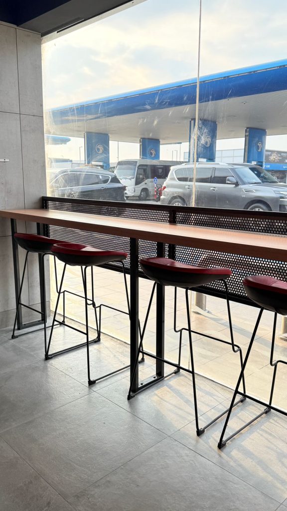 Large windows bring natural light and connect the inside with the outside view. This design is ideal for quick dining, family visits, and takeaway service, making the place look professional, organized, and welcoming for everyone.