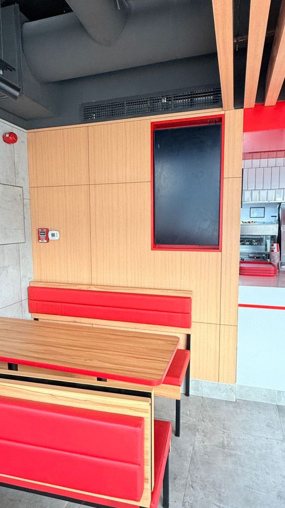 This modern fast food restaurant interior is designed for comfort, speed, and clear flow. The red and wood color theme creates a fresh, energetic feel that attracts customers and makes the space look warm and inviting. Soft seating, strong metal frames, and clean tables give a perfect balance of style and durability. Bright lighting and the open counter area help guests order and collect food easily.