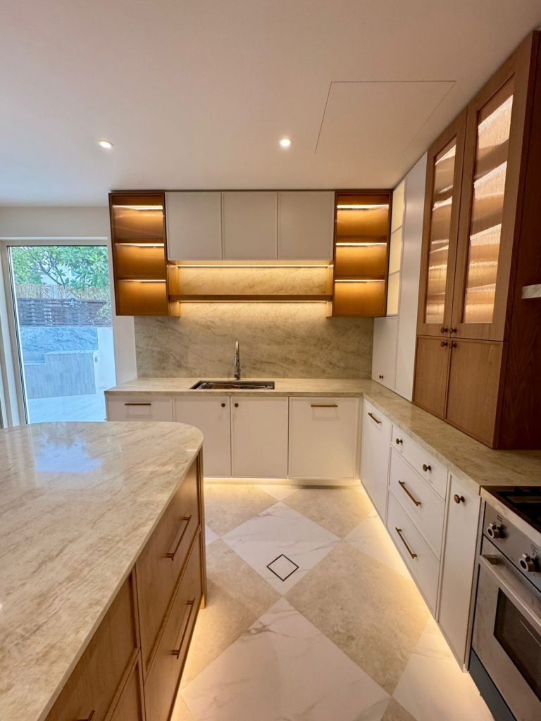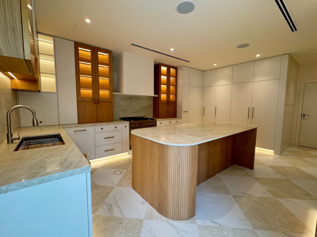 This modern kitchen is made to feel warm, open, and easy to use. Natural wood finishes, soft white cabinets, and stone surfaces give a calm and premium look. The wide island offers space for cooking, serving, and spending time with family. Built-in lights inside shelves and under cabinets create a soft glow that makes the room feel welcoming.
